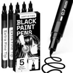 ブラックとホワイトのペイントペンセット。ロックペインティングに最適な5本セット。石、セラミック、陶器、タイヤ、ガラス、木、布、金属、キャンバスに使えるアクリル製。極細チップで精密な描画が可能。