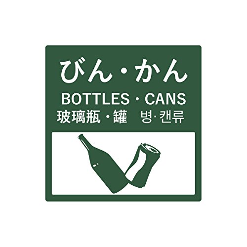 Biijoの4ヶ国語対応ごみ分別ステッカー。防水・耐熱のシールで、ゲストハウスや外国人観光客向けに最適。サイズは12cm×12cmおよび8cm×8cm。E.びん・かんの分別に役立ちます。