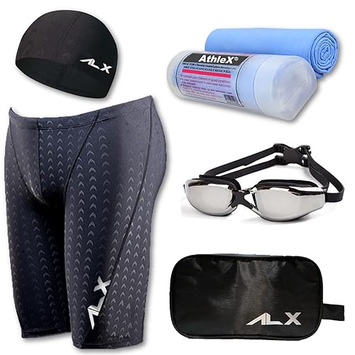 AthleX メンズフィットネス水着5点セット。競泳用水着、スイミングゴーグル、水中眼鏡、スイムキャップ、セームタオルが含まれ、大きいサイズ(4XL)も対応。プール備品に最適です。