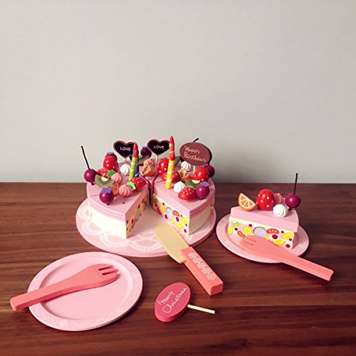 木製のおままごとセット。かわいいケーキやお菓子が含まれ、赤ちゃんや子供の想像力を育てる知育玩具。プレゼントにも最適なピンク色で、おままごと遊びを楽しめます。