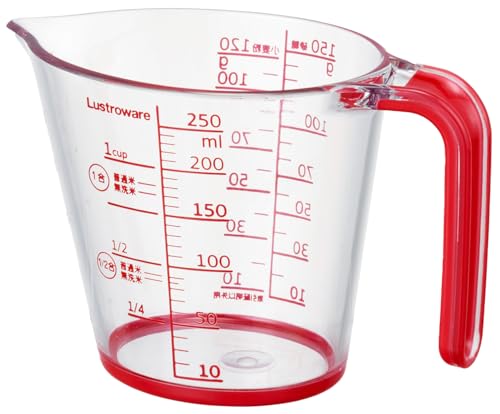 岩崎工業のラストロウェア計量カップは250mlの軽量で耐熱性があります。米、液体、砂糖、小麦粉などの計量に最適。食洗機対応で日本製。赤色のK-1557 Rです。