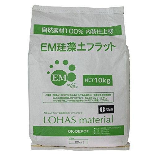 OK-DEPOTのLOHAS自然素材100% EM珪藻土フラット白花は、コテ・ローラー兼用の仕上げ材で、10kg入りです。優れた湿度調整効果と抗菌性があり、環境に優しい選択肢です。