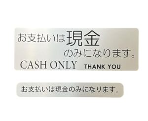 「お支払いは現金のみ」 現金払いサインプレート シルバーヘアラインカラー 大サイズ150mmX52mm,小サイズ129mmX18mmセット