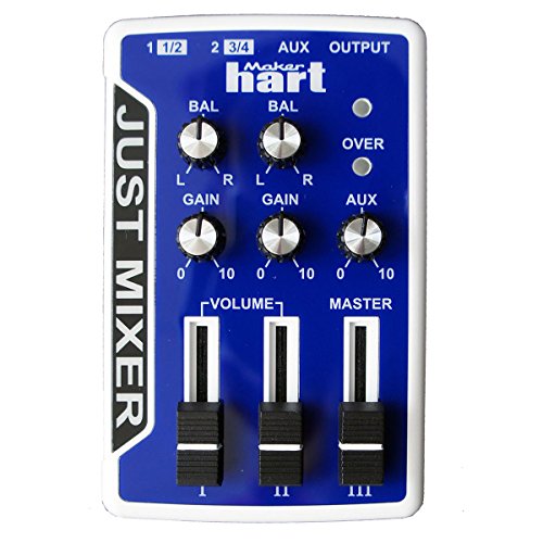 Maker hart Just Mixerは、ステレオ3入力を持つ音声ミキサーで、電池またはUSBでの電源供給が可能です。カラーバリエーションはブルーです。