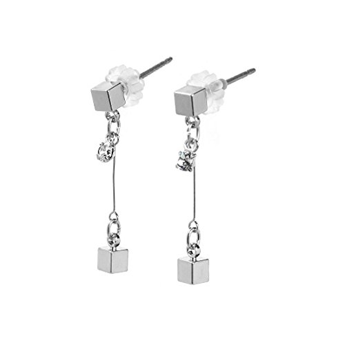 PLUSTERのロングピアスは、チタン製で金属アレルギーに対応。揺れるキューブデザインが特徴で、ホワイトゴールドカラーでエレガントに仕上げられています。専用ポーチ付きで、誕生日プレゼントに最適です。