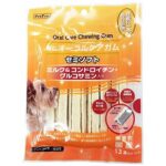 ペットプロの噛むオーラルケアガムは、セミソフトタイプでミルク風味。コンドロイチンとグルコサミンを配合し、歯と関節の健康をサポート。1パック13本入りを16個セットでお届け。