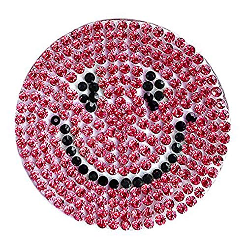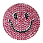 スマイルワッペン ストーン アイロン接着タイプ、サイズ縦4.5cm×横4.5cmのチェリーピンク色のミニスマイルニコちゃんデザイン。ラインストーンを使用したキラキラのアイロンワッペンで、手芸や衣服のアクセントに最適です。