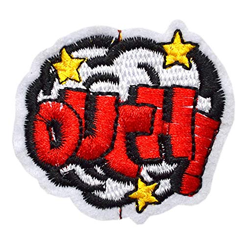ワッペンは縦5cm×横5.3cmのサイズで、アイロン接着が可能な刺繍デザインのフキダシアップリケです。手芸やカスタムに最適で、かわいいデコレーションにぴったりです。