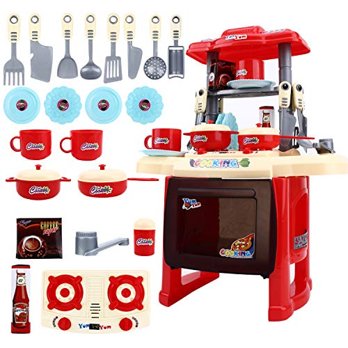 FlyCreat ままごと遊び キッチンセット台所 ままごとセット ままごとおもちゃ ごっこ遊び クッキングトイ 知育玩具 おもちゃ 組立式 鍋 お皿 フライパン フライ返し 食器 調理器具付 キッズ 子供用 女の子 男の子 おもちゃ 誕生日 クリスマス プレゼント (キッチン(レッド))