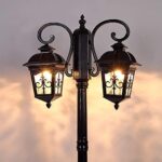Hinesアウトドアレトロパティオ住宅エリア用2灯LEDハイポールライト。防水仕様で、ビクトリアンスタイルのガラスランタンが特徴。E27ソケット、ガーデンやストリートに最適。