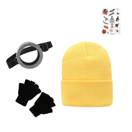 ハロウィンに最適なミニオン風コスプレセット。ゴーグル、帽子、手袋、タトゥーシールが含まれています。楽しみながら簡単にミニオンに変身できます。