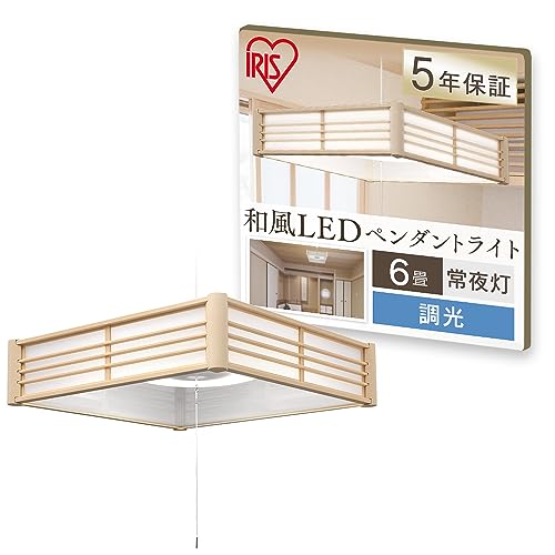 アイリスオーヤマのLEDペンダントライトPLM6D-Jは、6畳の和風空間に最適な調光機能付き。メタルサーキットシリーズで、シンプルかつスタイリッシュなデザインが特徴です。