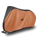 自転車カバーは子供用で、防水・厚手・丈夫。撥水加工とUVカット機能付き。風飛び防止、破れにくく、24インチまで対応。収納袋付き。カラーはブラック&オレンジ。