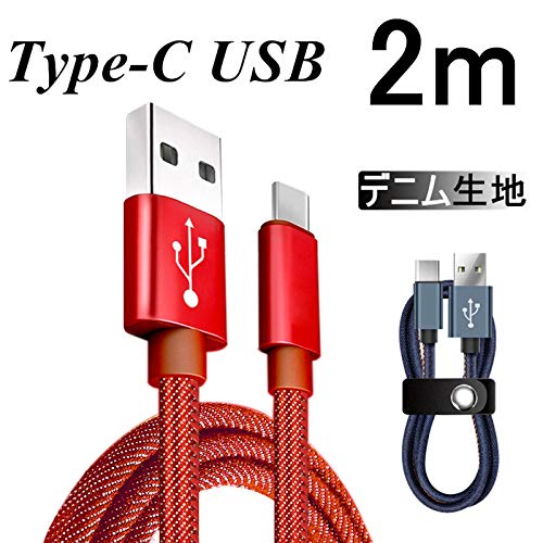 USB Type-Cケーブル 2m、デニム生地デザイン、高速充電対応。データ転送も可能で、AndroidやGalaxy、HUAWEIなどに最適。収納ベルト付きで持ち運び便利。