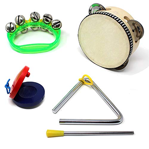 子供向けの楽器4点セット。高品質な本革タンバリン、トライアングル、カスタネット、ハンドベルが含まれています。リトミックや知育に最適な定番のおもちゃです。音楽の楽しさを学びながら、指先の運動能力やリズム感を育てます。
