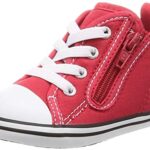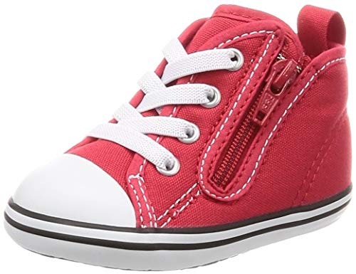 コンバースのベビーオールスター N Zは、赤色の可愛いデザインで12cmのサイズ。柔らかな素材で、赤ちゃんの足にも優しいフィット感を提供します。おしゃれで元気な印象の一足です。
