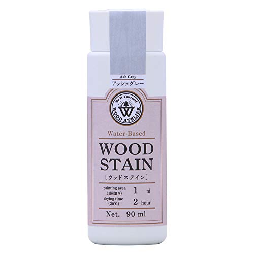 和信ペイントの水性着色剤「ウッドアトリエ ウッドステイン」は、木目を生かした美しい着色が可能です。アッシュグレーの90ml入りで、木材の自然な風合いを引き立てます。