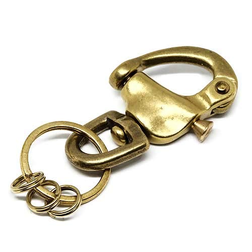 真鍮製のLサイズスナップシャックルキーホルダー。二重リング仕様で、強度と使い勝手を確保。ミリタリースタイルや日常のベルトループに最適なカラビナ付き。