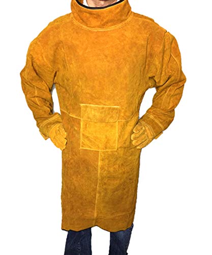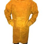 JP牛革製の耐熱溶接用エプロン。大判115cm、ツールポケット付きで防炎性能あり。やけどや火の粉から守る防護服として作業服に最適。
