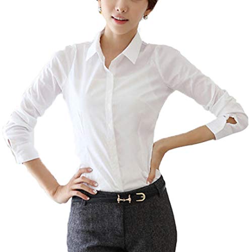 レディスファッションの長袖シャツ。色は白、黒、ピンク、水色。サイズはSS~3L。定番のレギュラーネックデザインで、オフィスやビジネスシーンに最適。モデルは白のMサイズ。