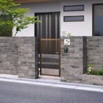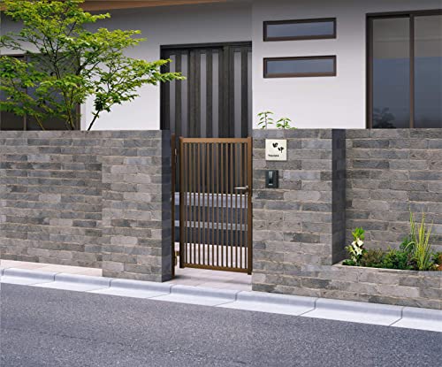 縦格子門扉は、片開きタイプで扉幅600mm、高さ1000mmの内開き設計です。門柱タイプでブロンズ仕上げのため、耐久性と美観を兼ね備えています。