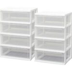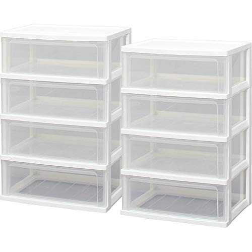 アイリスオーヤマのチェストワイドセット(4段×2個)は、日本製の収納家具。サイズは幅54×奥行40×高さ82.2㎝で、ホワイト&クリアのデザインです。プラスチック天板付きの完成品です。