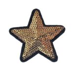 星の形をしたゴールドのスパンコールアイロン接着ワッペンです。手芸やカスタムデコレーションに最適で、簡単にアイロンで接着できます。アップリケとしても使用可能。
