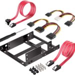 YFFSFDCの2.5インチHDD・SSD変換フレーム。3.5インチ内蔵HDDの増設用、SSDアダプター。インストールツール、SATAデータケーブル2本、電源ケーブル2本付属。接続時は注意が必要。