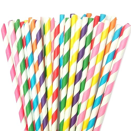 ストライプペーパーストロー250本入り。生分解性でリサイクル可能。虹のすべての色が揃い、パーティーやイベントに華やかなタッチを加えます。