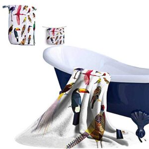 オレンジとピンクの装飾的な繰り返しのデザインが特徴のバスタオル3点セット。100%マイクロファイバー製で、バスルームやオフィス、ジムでの使用に最適。サイズ: W20″xL39.3″, W8″xL23.5″, W10″xL10″。