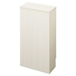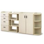 moca companyのRoundearカウンター下収納4点セットは、扉と引出し付きで、伸縮可能なコーナーにフィットする薄型デザイン。ホワイトの木目調が温かみを加え、収納力を確保しつつスッキリした印象を与えます。
