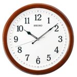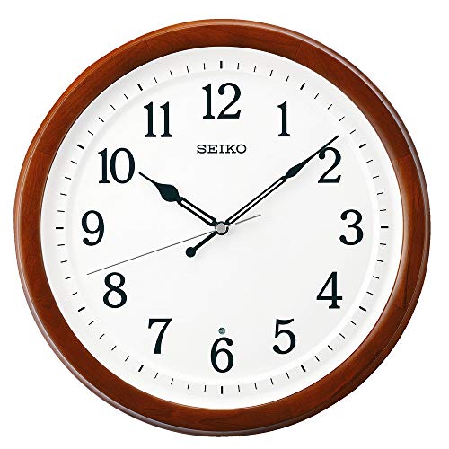 セイコークロックの掛け時計、電波式アナログモデル。UDフォントを使用した見やすいデザイン。茶木地仕上げで、直径32.2cm、厚さ4.9cm。シンプルでインテリアに馴染むスタイルが魅力です。