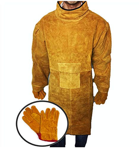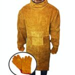 全長115cmの耐熱溶接用エプロンです。牛革製で大判タイプ、ツールポケット付き。防炎機能があり、溶接や作業時のやけどや火の粉から身体を保護します。