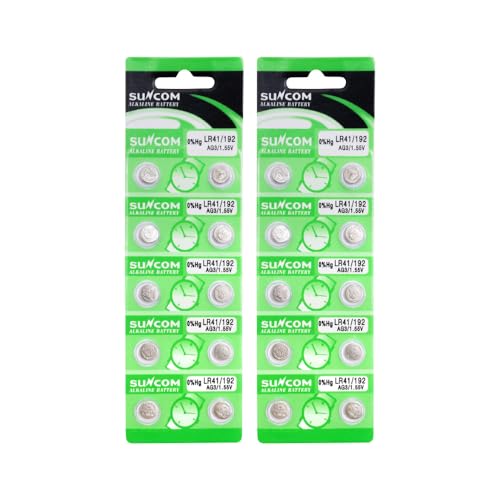 SUNCOMアルカリボタン電池LR41は高性能な20個セットで、小型電子機器に最適です。信頼性が高く、長寿命。玩具、時計、計算機などに広く使用されています。