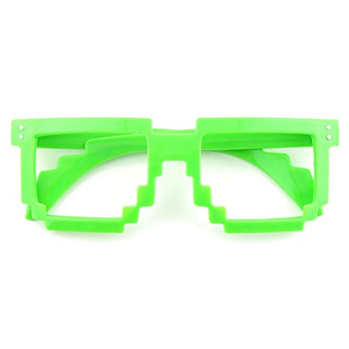 インベーダーのモザイクデザインの伊達メガネ(レンズなし)。カラフルなグリーンのフレームが特徴で、おしゃれなソフトケース付き。サイズはユニセックスで、日常使いやコスプレに最適です。