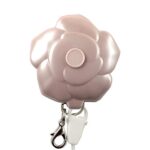 デコプティの収納式ネックストラップは、46センチの長さでスマホや入館証、キッズ携帯に最適。ピンクのローズ型デザインで、忘れ物防止や防災グッズとしても活躍します。