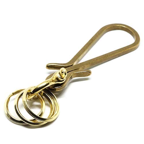 真鍮製のツリバリフックキーリング(大サイズ・シャックル仕様)。耐久性に優れたデザインで、釣り針やベルトループに適応。ゴールドの光沢がスタイリッシュなウォレットチェーンにも最適です。