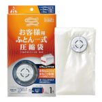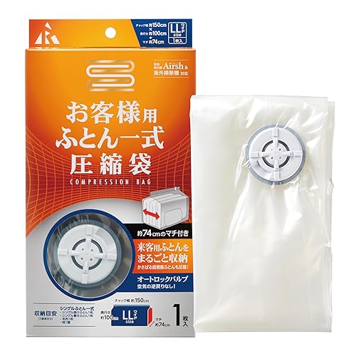 アール(R) 圧縮袋は、圧縮可能なふとん一式が収納できる透明無地のバッグです。サイズは150×100×74cmで、バルブ式で繰り返し使用可能です。収納スペースを節約できます。
