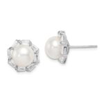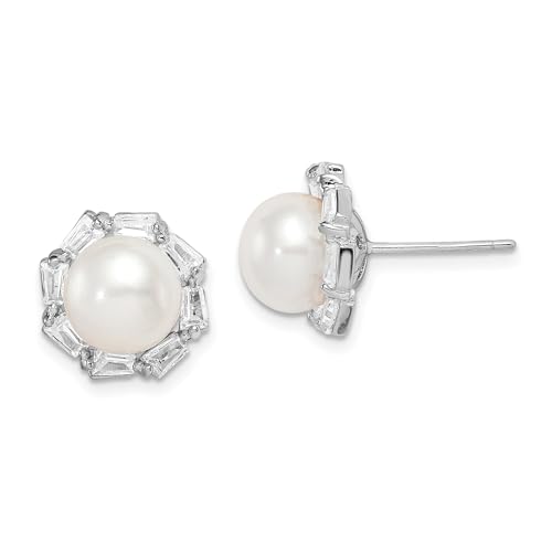 925スターリングシルバー製のポストスタッドイヤリング。9mmのホワイトボタン淡水パールとキュービックジルコニアが輝くファインジュエリー。女性へのギフトに最適です。