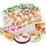 レジン封入素材として最適なフィルムシートです。金魚イラストや和風金魚鉢、水草、浮草、桜の花びらがデザインされており、夏の雰囲気を楽しめます。レジン作品に彩りを加えるアイテムです。