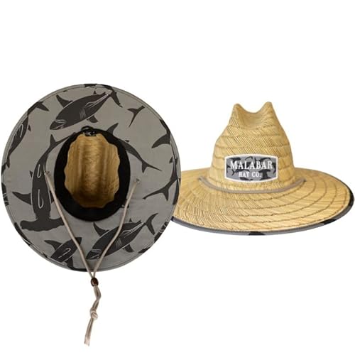 Shark 大人用ファブリックパターンプリント麦わらサンハット。男女兼用、ライフガードハットとしてビーチやアウトドアに最適。サイズはワンサイズ、Malabar Hat Co製。