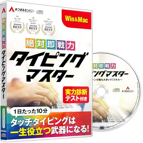 あつまるカンパニーの絶対即戦力タイピングマスターは、Win&Mac対応のタイピング練習ソフト。タッチタイピングを習得し、キーボードスキルを向上させるためのディスク付きプログラムです。