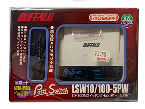 BUFFALOのPetitSwitch 10/100MスイッチングHub LSW10/100-5PWは、5ポートのAUTO-MDIX機能搭載。自動で二重・単線を判別し、簡単に接続できる。省スペース設計でオフィスに最適。