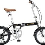 キャプテンスタッグのAL 16インチ折りたたみ自転車は、アルミフレームで軽量約10.6kg。シマノ6段変速、前後V型ブレーキ、SHIMANOパワーモジュレーター、高ギア比設定が特徴です。