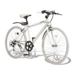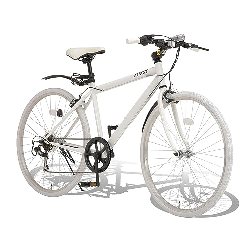 アルテージのクロスバイクACR-001は、26インチのシマノ製6段変速で、通勤や街乗りに最適。スローピングフレーム、可変式ハンドル、LEDライト、鍵、泥除け付きで初心者にも扱いやすい。カラーはホワイト。