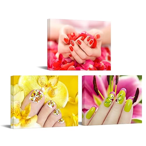 Nachic Wallの3ピースキャンバスアートは、ファッションとビューティーをテーマにしたネイル写真です。木製フレーム付きで、スパやバスルーム、メイクアップルームのデコレーションに最適です。