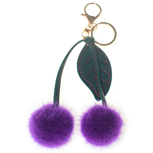Fosrionの高級ミンク毛皮のサクランボ型手提げは、緑の葉付きの鍵が魅力的。パープルカラーが特徴で、スタイリッシュなアクセサリーとして最適です。