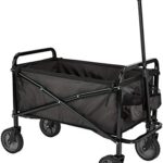 Amazonベーシックのユーティリティワゴンは、105D x 50.5W x 118H cmのサイズで、折りたたみ式。ガーデンツールに最適で、アウトドア向けのカバーバッグ付き。カラーはブラックです。