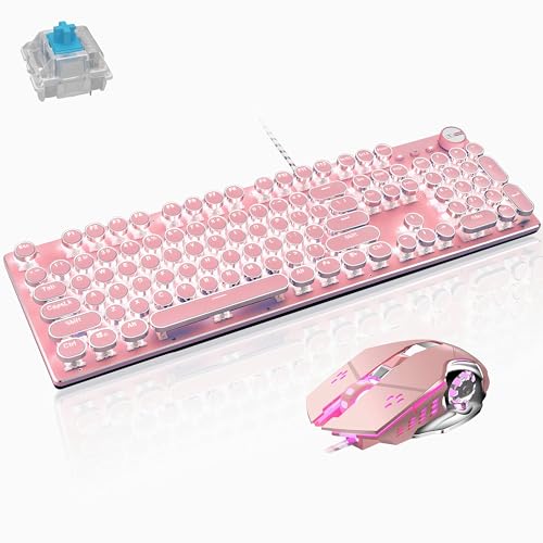 Basaltechのレトロスチームパンクヴィンテージタイプライタースタイルキーボード&マウスコンボ。104キー、アンチゴーストブルースイッチ、LEDバックライト付き、メタルパネル、ピンクの丸いキーキャップ。