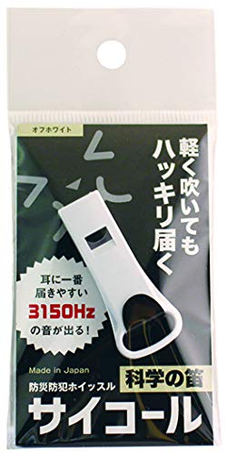 三和製作所の防災防犯ホイッスル「サイコール」は、オフホワイトカラーで視認性が高く、軽量で携帯しやすい設計。緊急時に高音で音を響かせ、安心を提供します。